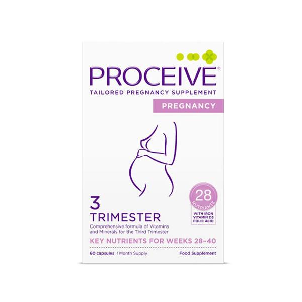 This is a comprehensive, active blend of 28 vitamins, minerals and amino acids scientifically formulated for this stagDuring the third trimester, the baby continues to grow in size and weight and you body prepares for labour and delivery.Proceive® Pregnancy Trimester 3 offers tailored nutrition for both you and your baby during the final 12 weeks of pregnancy. This is a comprehensive, active blend of 28 vitamins, minerals and amino acids scientifically formulated for this stage.Take two capsules once per day. Best taken in the morning on a full stomach. We recommend taking Proceive® Omega 3 with this product.